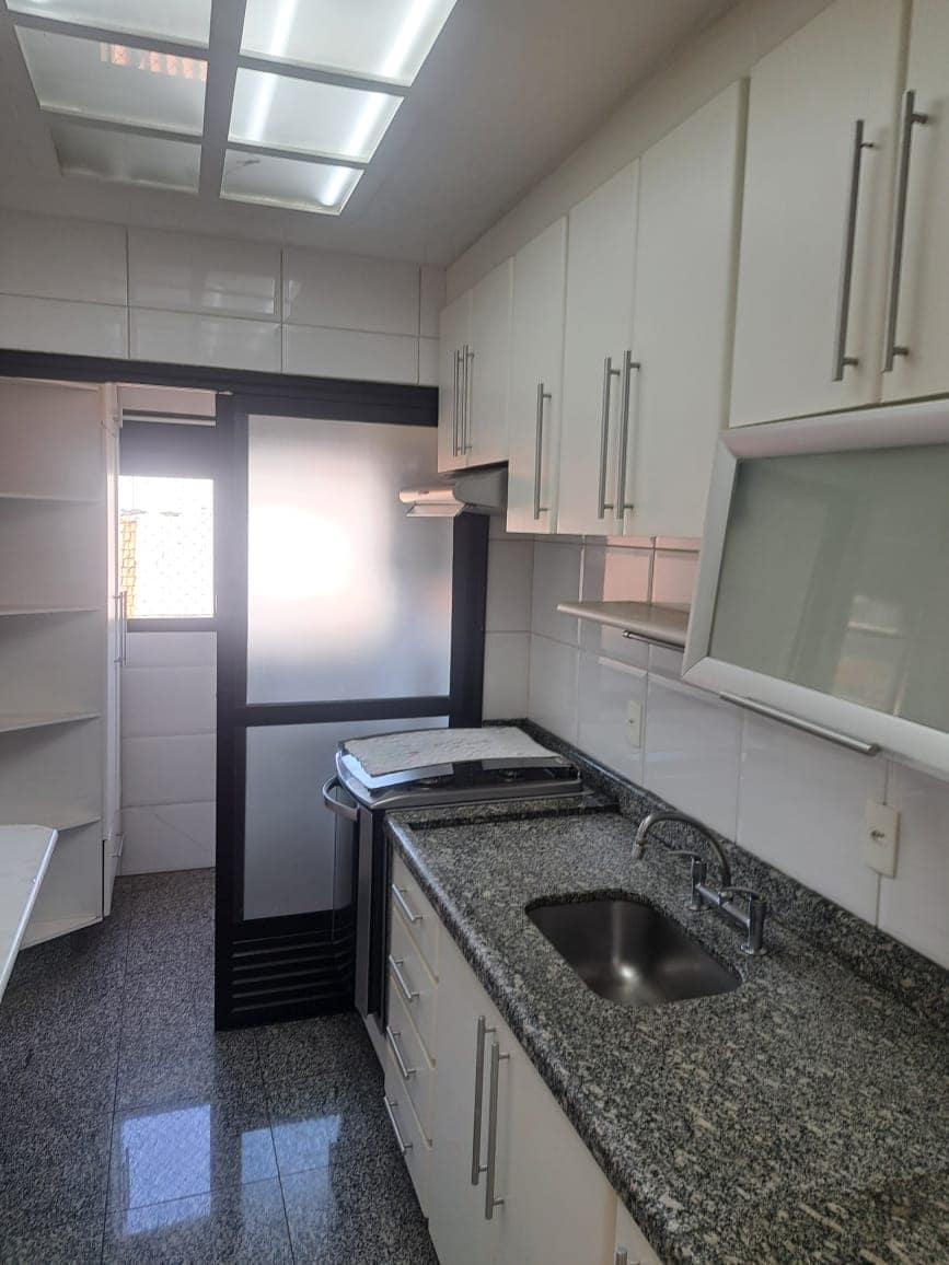 Sacada fechada com vidro, cozinha planejada com piso em granito, dormitórios com armários, 2 banheiros no total com chuveiros a gás e ventilação natural, lavanderia, aquecedor, e vaga coberta e espaçosa.