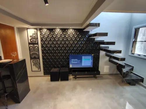 Não tem vizinho na frente/fundo parede de divisa do apto com vedação acústica e quintal privativo.
