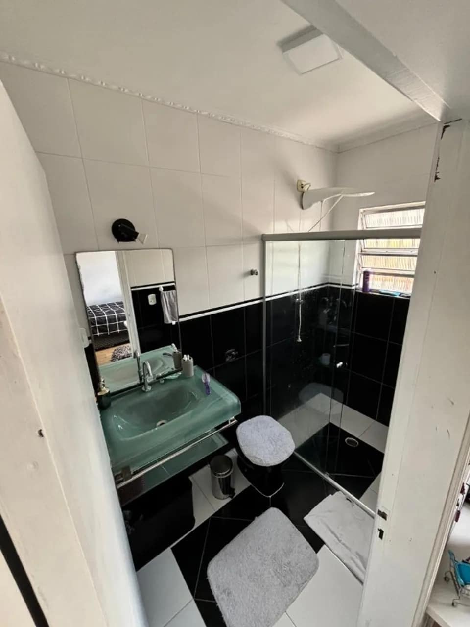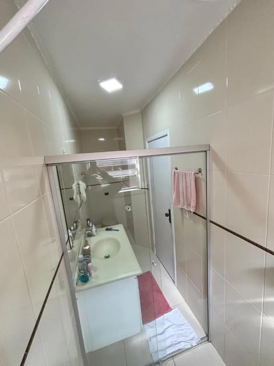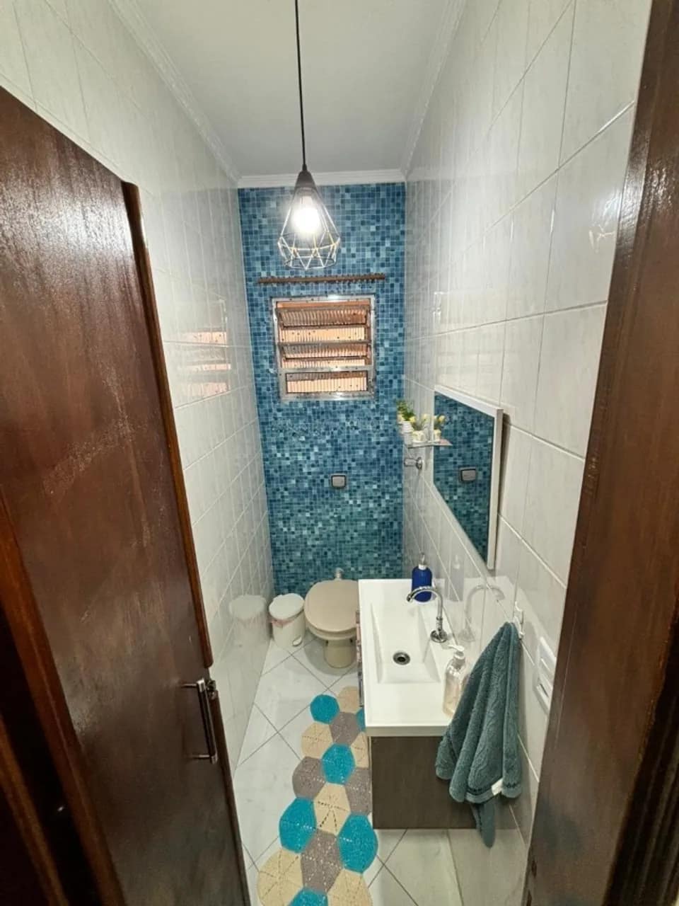 Sala ampla com piso porcelanato e lavabo