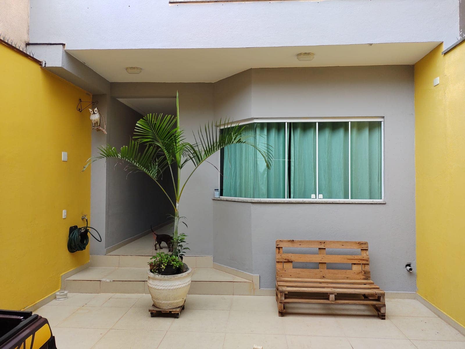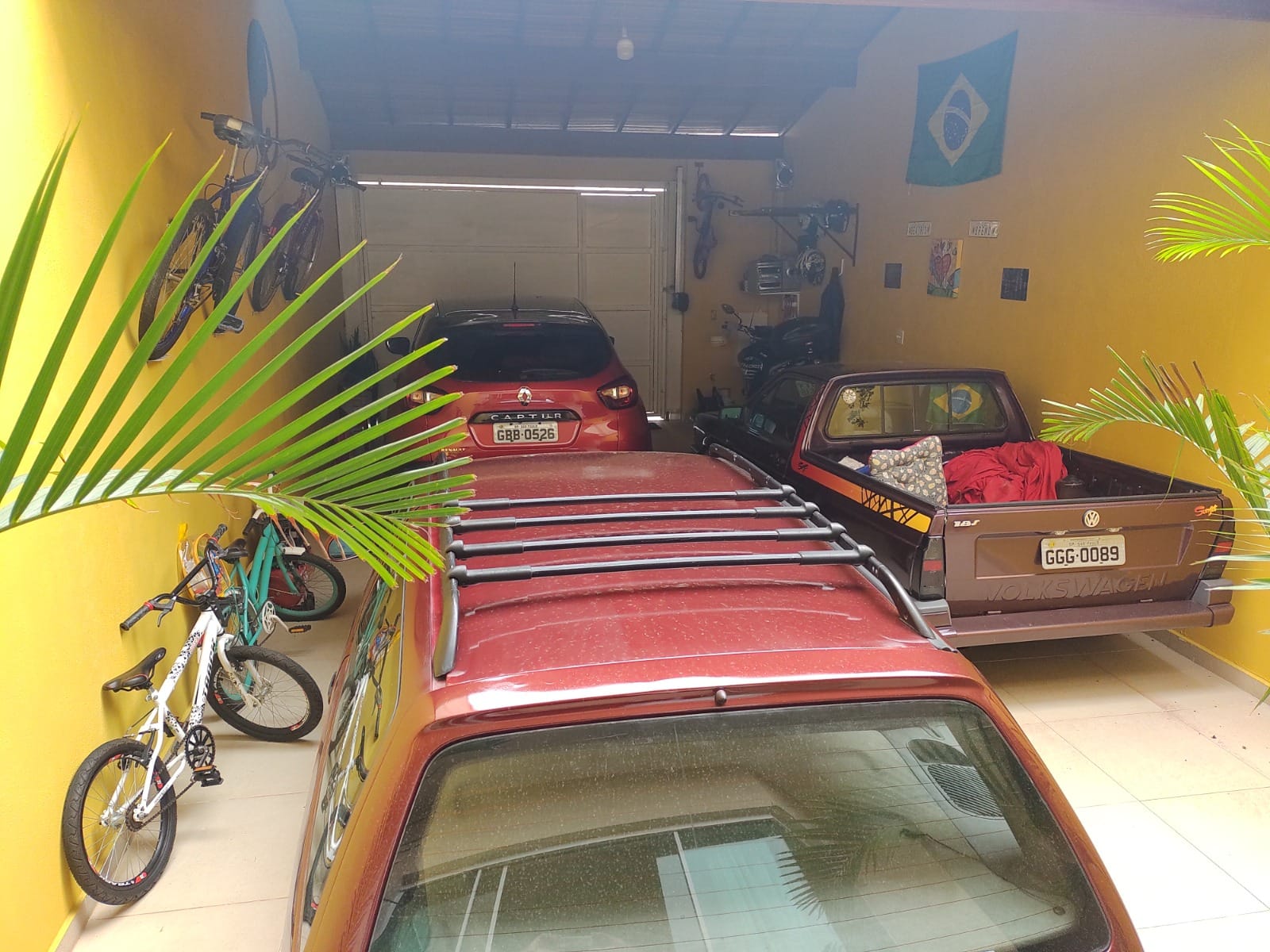 Garagem para 04 veículos grandes sendo 70% coberto com telhado conta com portão basculante eletrônico PPA