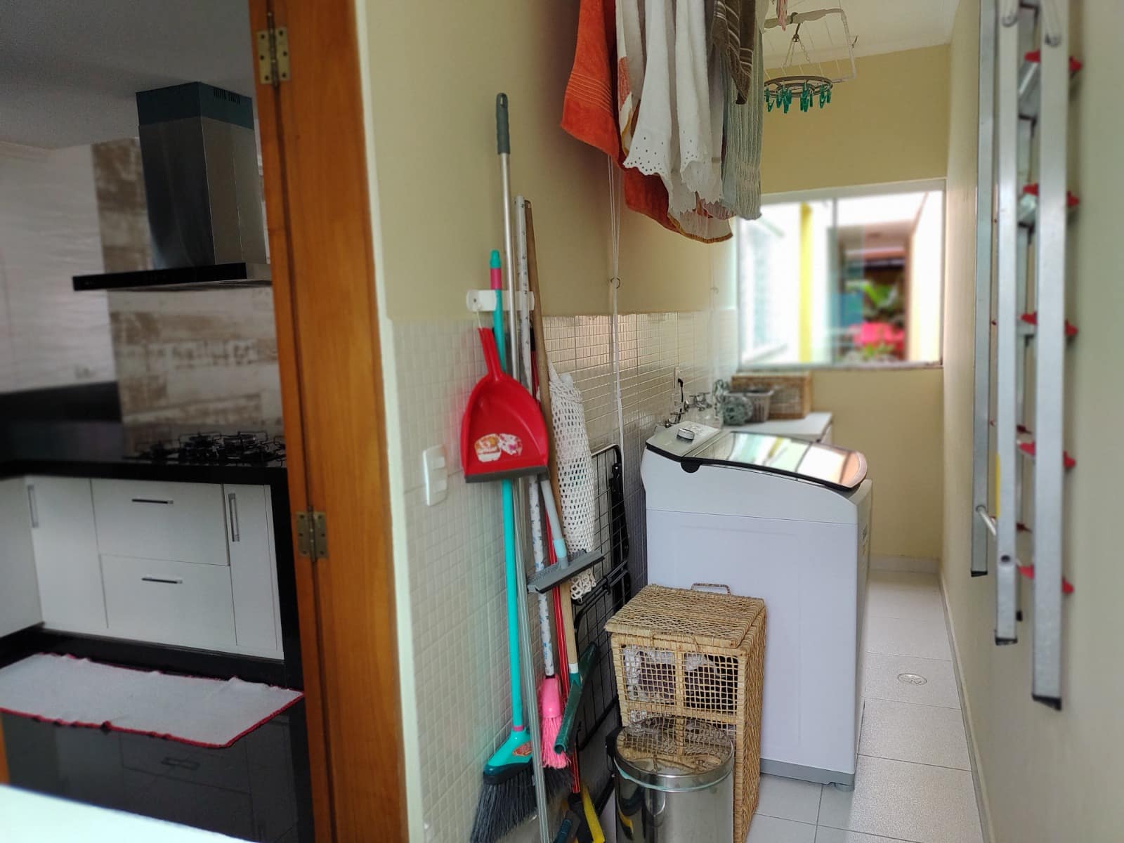 Lavanderia ao lado da cozinha com tanque deca, 02 armários: 1 produtos de limpeza + casa do botijão de gás, outro como sapateira, 02 varais de teto retrátil.