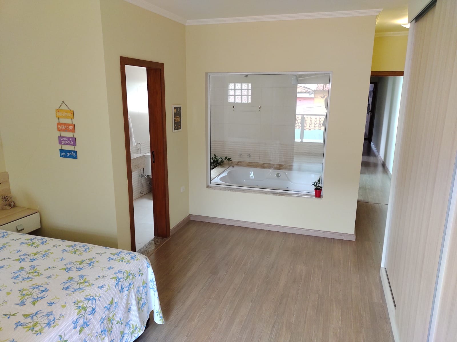 01 Suíte Master ampla com hidromassagem dupla, armário planejado painel da cama com 02 criados mudos embutidos e sacada com guarda corpo em alumínio branco e vidro (total 7,30 x 5,00).